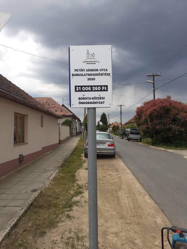A Magyar Falu Program keretében a borotai Petőfi Sándor utca meglévő aszfalt útburkolata került felújításra. Az utca kétirányú forgalommal a helyi lakossági forgalom,és az ezen úton megközelíthető telephelyek, intézmények, személy és teher, közösségi közlekedési forgalmának lebonyolítására szolgál.